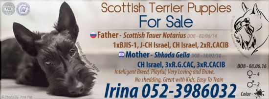 גורי סקוטיש טרייר למכירה! ת.ל: 08.06.2016 כלב חכם וקל לאילוף, שמח, פעיל ואוהב ילדים. מאוד חברותי ונאמן. אינו תוקפני. מי שרצה כלב גדול ולא הייתה לו אפשרות זהו הכלב המושלם בשבילו, "כלב גדול באריזה קטנה". כלבים גזעיים עם תעודות, אמא אלופת הארץ, אבא אלוף צעיר ואלוף ישראל. בעת מסירת הגורים, הם יהיו מחוסנים, אחרי תילוע, שבב ומסופרים. אין נשירה אבל דורש טיפוח קבוע. מכירה בכל הארץ