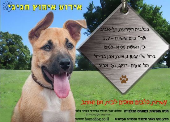 יום אימוץ חגיגי בכלביה העירונית ת"א בשישי ה-5.7 בין 10-14. כלבים חברותיים מכל הגדלים והגילאים ממתינים לכם. ש"י עגנון 1, פינת אבן גבירול, מול מתחם רידינג.