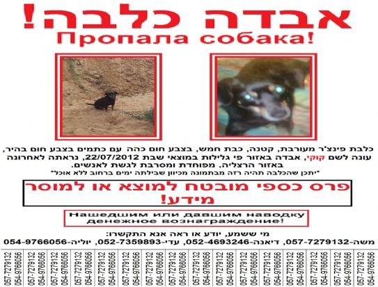 בתאריך 22.9.2012 בסביבות השעה 23:00, אבדה כלבה קטנה, בת 5, מסוג פינצ'ר מעורב, בצבע חום כהה מאד עם כתמים בהירים, עונה לשם קוקי, אבדה באזור פי-גלילות אשר בת"א. הכלבה מפוחדת ומסרבת לגשת לאנשים שאינה מכירה. אנו דואגים לה מאד מאד, אז אנא, אם מישהו ראה/שמע/מצא אנא צרו קשר בהקדם, בשעות היום והלילה, שבתות וחגים. אנא עזרו לנו להחזיר את קוקי הביתה