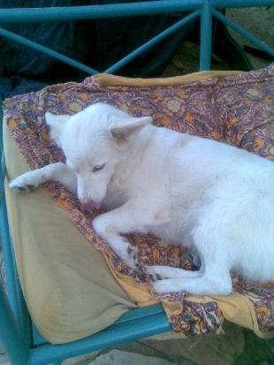 מדובר בכלבה מגזע שפיץ כלשהו, בינונית בגודלה, פרווה לבנה, ארוכה, סמיכה ומלוכלכת.