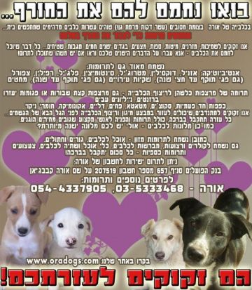 אוהבי בעלי"ח שלום, אם בא לכם לעשות מצווה, עיזרו לאורה. היא מצילה עשרות כלבים וחתולים וזקוקה לכל עזרה שהיא מצידכם. היא נמצאת בצומת מסובים. כנסו לקובץ המצורף וראו למה היא זקוקה. אם יש לכם אנטיביוטיקה לתרום, זה יתקבל בברכה כי יש לה כלבים עם שעלת והיא זקוקה לכך בדחיפות (אפשר להוציא אנטיביוטיקה עם מרשם וכך זה יותר זול). כמו כן, מלונות, אוכל, מצעים, בלטות שאתם לא צריכים כדי לרצף את המקום כמה שיותר... תודה בשמה ובשם הכלבים והחתולים