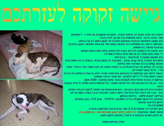 אני מעורבת ומעוקרת ואני בת שנה וחצי. ההורים שלי הצילו אותי בגיל 3.5 חודשים מכלביה לאחר שזרקו אותי מרכב נוסע בפארק הירקון. לצערנו אנו נאלצים להיפרד כי הם צריכים לנסוע לארץ זרה וקרה.