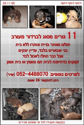 הי ידידי, ברחובי בחיפה נמצאה כלבה מסוג זאב מעורבת נטושה ומפוחדת, על צווארה משתלשל סרט ישן וקרוע שמראה שפעם היה לה בית... הנפש האומללה עמוסה כעת בחמישה גורים וכולם נמצאים במאורה. גורה אחת נמסרה לאימוץ נהדר, חייבים למצוא בתים נפלאים גם לחמשת אחיה ואחיותיה המתוקים!! האבא הינו לברדור שחור, הגורים יהיו בגודל בינוני, האמא רק 20 ק"ג לערך.