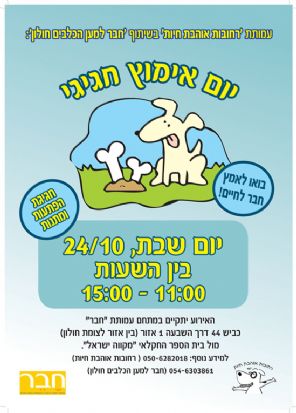 יום אימוץ חגיגי,שבת 24/10 בין השעות 11:00-15:00,עשרות כלבים מכל הסוגים.יום האימוץ מתקיים בעמותת "חבר למען הכלבים"בין אזור לצומת חולון,מול מיקווה ישראל על כביש 44. כל הכלבים מחוסנים ומעוקרים/מסורסים כמו כן,אימוץ כלבים מדי יום,בתיאום מראש ,כנסו לאתר "רחובות אוהבת חיות" בגוגל וצפו בתמונות הכלבים המעודכנות. http://www.rehovotlovesanimals.org/