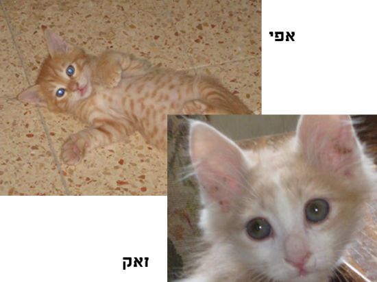 ארבעה גורים (מתוך 9 שהיו) מחפשים: אפי הג'ינג'י, עופרה הטריקולורית, נחשון הטאבי ופינגווין השחורה לבנה. כמו-כן גור נוסף מצא דרכו אל רימונה- היא אספה אותו בעודו בן חודש לאחר התעללות - שמו זאק הוא בצבע שמפניה, בן ארבעה חודשים כעת והוא קיבל כבר חיסונים. למתעניינים בגורים מצ"ב לינק עם תמונות הרביעייה+זאק: http://picasaweb.google.com/rimona.gher/2009# למעוניינים ליצור קשר עם רימונה בעניין הגורים (ושוב חשוב להדגיש - הגורים גרים כעת בירושלים)