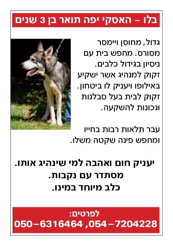 מחפש בית עם ניסיון בגידול כלבים. זקוק למנהיג אשר ישקיע באילופו ויעניק לו ביטחון, בית בעל סבלנות ונכונות להשקעה.