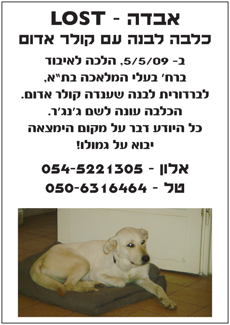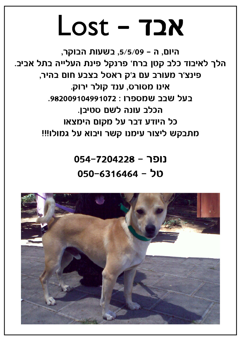 שלום לכולכם, צ'אפה, הכלב של אחי אבד לפני שבועיים (בחול המועד) בשדות בין קיבוץ יגור לכפר חסידים. מנסיון של אנשים אחרים אשר כלבם אבד ונמצא הוא יכול להיות בכל מקום בארץ. אם ראיתם נודה לכם מאוד אם תיצרו איתנו קשר לטלפונים: 052-8377023 אסיה 052-4488644 זאב פרס כספי של 1000 ש"ח מוצע למי שימצא אותו עבורנו תודה לכם מאוד מראש
