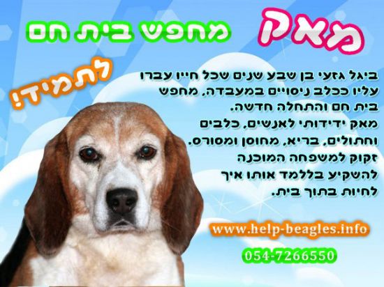 ביגל גזעי בן 7 ידידותי, מחוסן ומסורס מחפש בית אוהב.