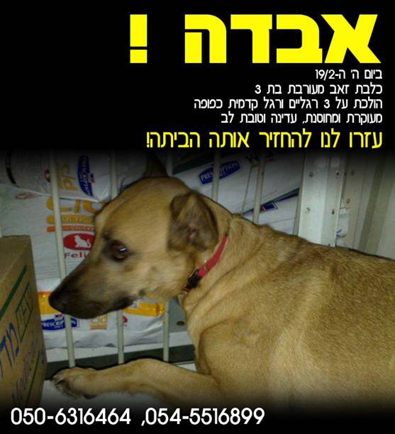 הכלבה הזו נאבדה ב 19/2 ברמת גן. היא כלבת זאב נפלאה בת שלוש עם רגל קדמית כפופה... מישהו ראה אותה?