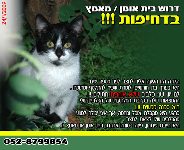 אם יש בלבכם מקום, רצון או אהבה לבעלי חיים בקשה אימצו גור ותנו לו חיים. המציל נפש אחת כאילו הציל עולם ומלואו! תודה רבה על עזרתכם' תבורכו, ואמן שהמצב כבר ירגע ... תודה רבה אורנה.